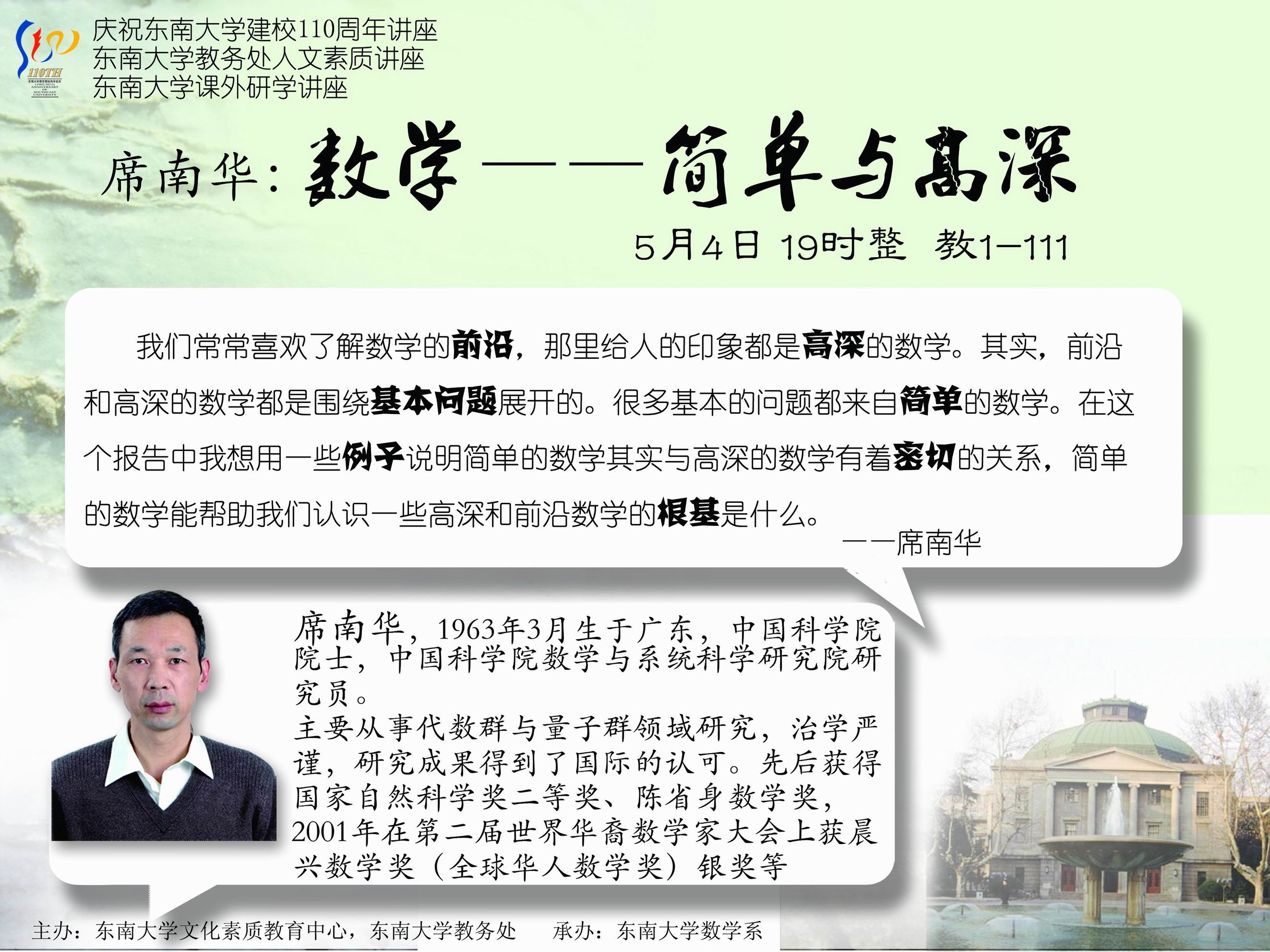 为庆祝yL23411永利官网登录建校110周年,yL23411永利官网登录数学系诚邀到了中国科学院院士,数学家席南华教授与东大学子分享关于数学的简单与高深。