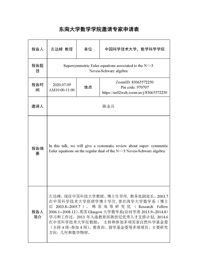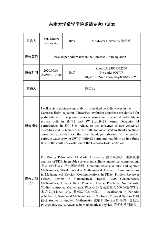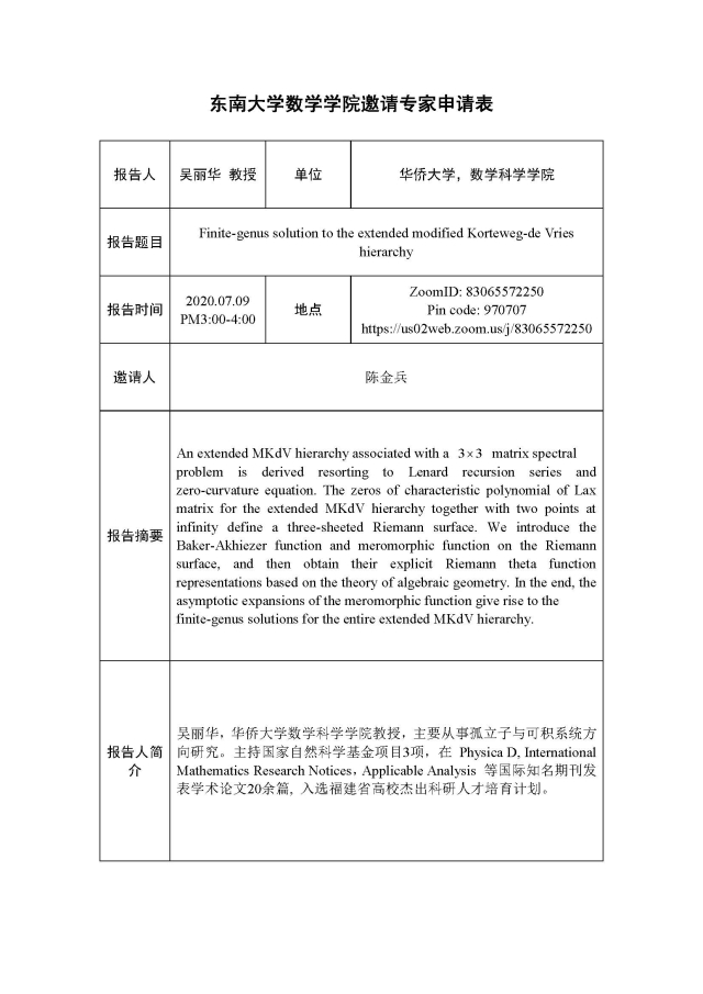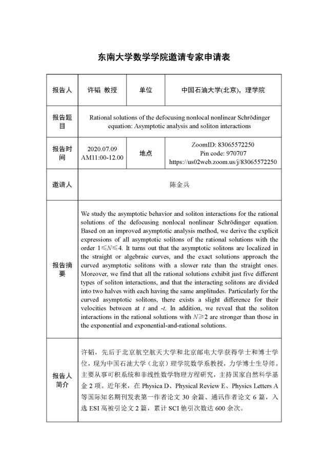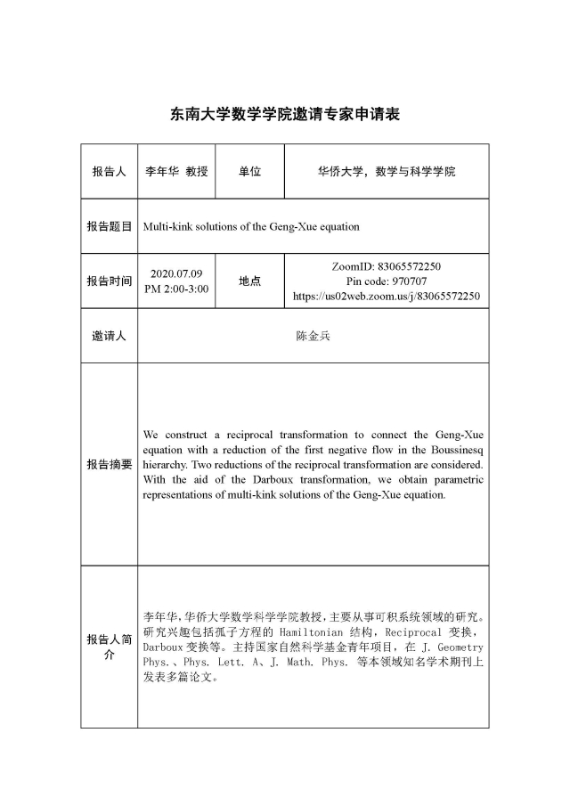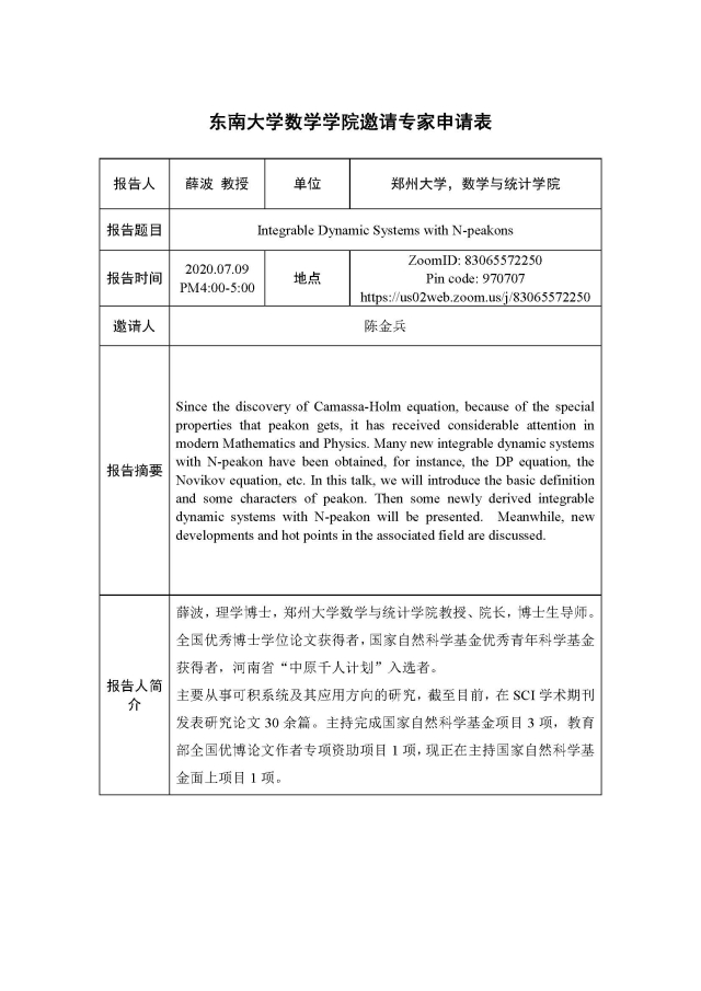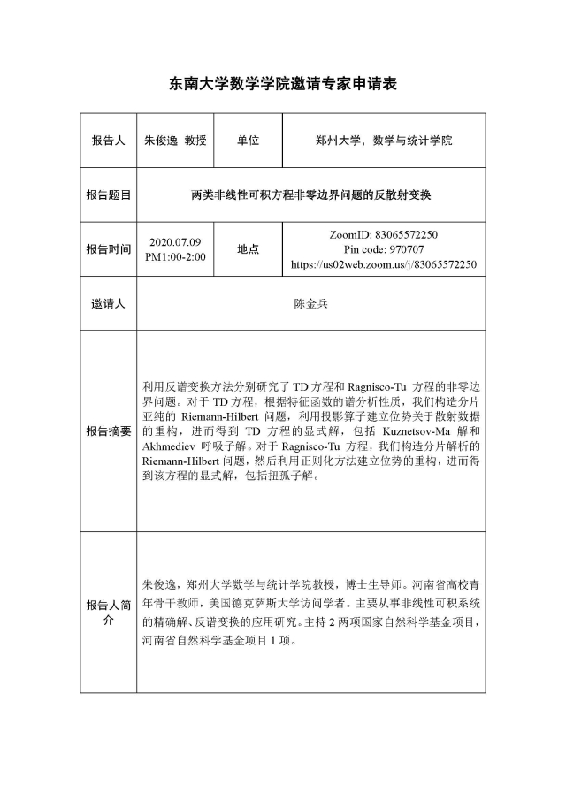 学术论坛:2020年07月09日,可积系统及其应用