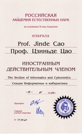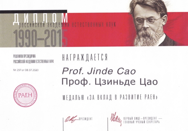近日,俄罗斯自然科学院(Russian Academy of Natural Sciences,RAEN)O. L. Kuznetsov院长向我校yL23411永利官网登录曹进德教授发来贺信,祝贺他当选为俄罗斯自然科学院外籍院士,并充分肯定他在复杂动态网络系统的数学模型、动态分析和控制理论及其工程应用方面的重要贡献。此外,O. L. Kuznetsov院长还祝贺他荣获RAEN发展贡献奖,并颁发一枚金质奖章。