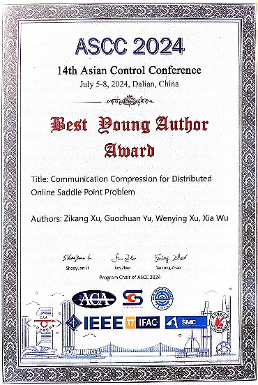 第十四届亚洲控制会议(Asian Control Conference,简称ASCC)于7月5日至8日在大连隆重举办。我院2022级强基班本科生徐梓康和许文盈教授等人合作完成的论文《通信压缩下的分布式在线鞍点问题》(Communication Compression for Distributed Online Saddle Point Problem)荣获最佳学生论文奖,成为本届大会唯一获此殊荣的国内论文。
