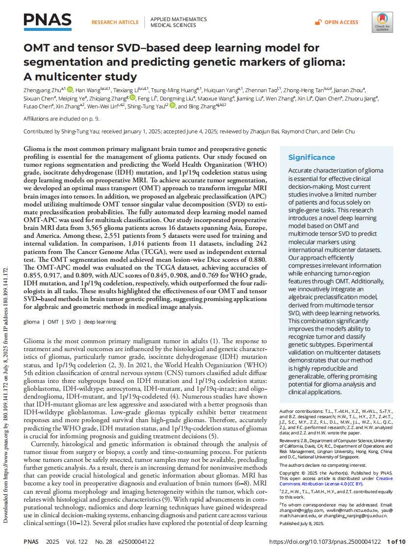 2025年7月9日,yL23411永利官网登录、丘成桐中心李铁香教授与合作者在国际顶级学术期刊《美国国家科学院院刊》(Proceedings of the National Academy of Sciences of the United States of America,PNAS)上发表题为《用于神经胶质瘤分割和遗传标记预测的基于最优传输和张量奇异值分解的深度学习模型:一项多中心数据研究》(OMT and tensor SVD based deep learning model for segmentation and predicting genetic markers of glioma: a multicenter study)的学术论文。《美国国家科学院院刊》是国际顶尖综合性期刊,与Nature、Science、Cell并称全球四大综合科学期刊,近五年影响因子为10.6,位列中科院SCI一区12,学科涵盖生物、物理、化学、数学及社会科学,多学科大类排名前5%,对原创性要求极高。